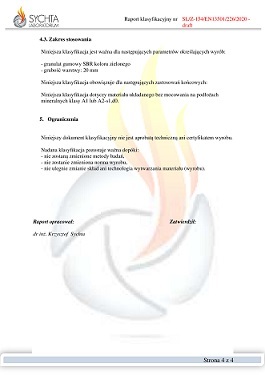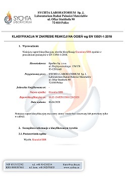 El caucho está cubierto por una capa especial de PU ignífugo que hace que todo el gránulo sea ignífugo. Dichos gránulos también pueden colorearse y usarse para el relleno de césped artificial o superficies deportivas de PU que se usan en interiores, donde se deben cumplir los estrictos requisitos de seguridad contra incendios.